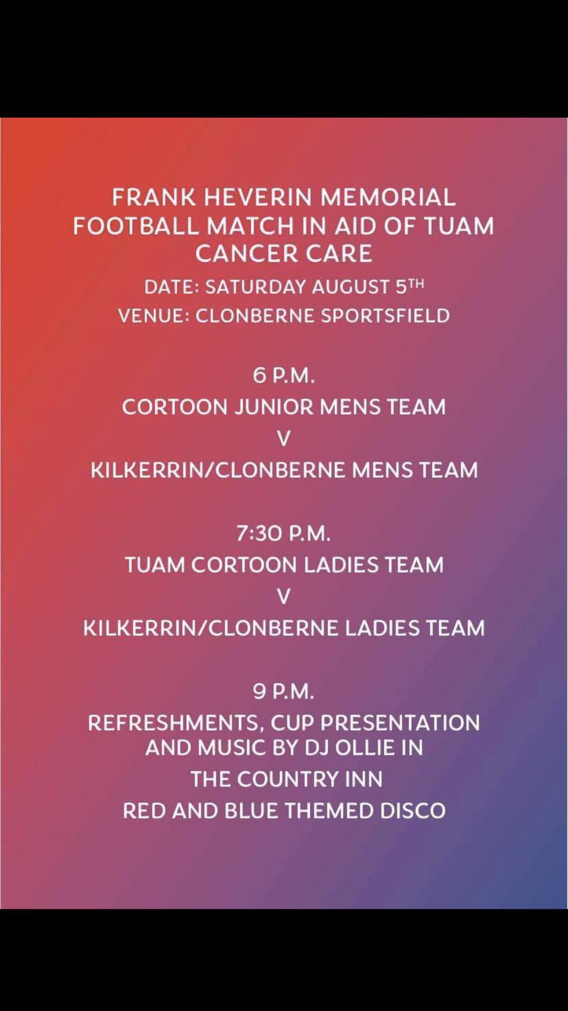 All proceeds on the day and night will be donated to Tuam Cancer Care. The football will be followed by refreshments for the teams in The Country Inn and the Cup presentations, followed by a disco with DJ Ollie.
